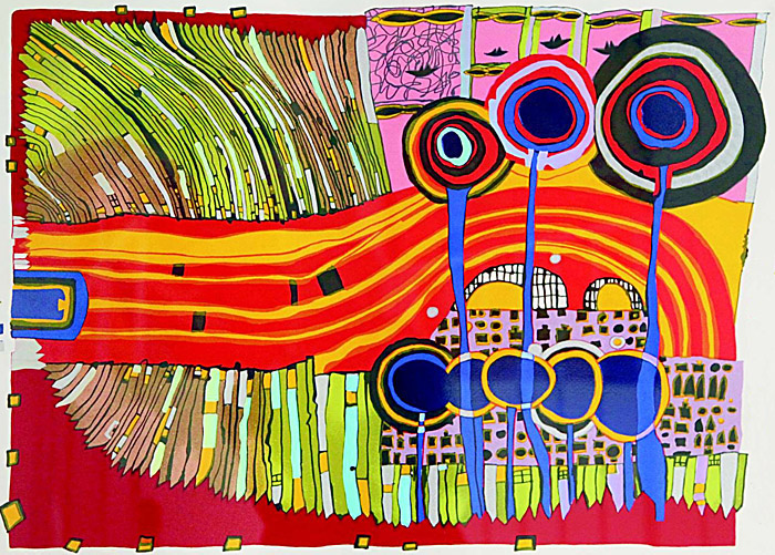 Before that, in Vienna 1974, she meets another internationally renowned artist, Friedensreich Hundertwasser. She is seduced by his vigorous graphics and the taste for color, the two chracteristics of her own work.