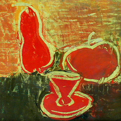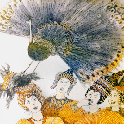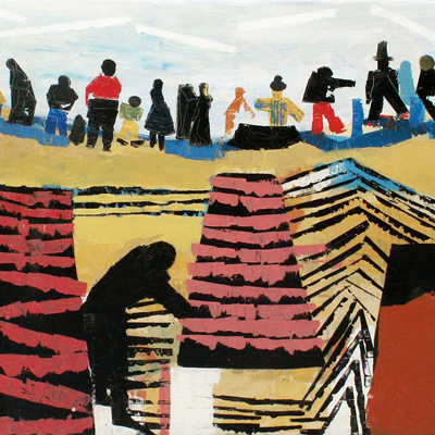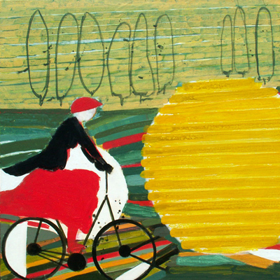 In her work, Kristina freely transposes the reality and only very seldom crosses the threshold to abstraction. In her world, poetic and colorful, there is sun and even suns, but not the moon. Animals of all kinds, towns and roads, but very few trees. One eats fish, apples, and watermelons; drinks are served in pretty pitchers and cups. One travels on bicycle. And this world is populated by women! The scarce men appear in general as anonymous silhouettes in the middle of a crowd.